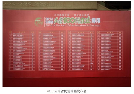 8月27日,云南省企业联合会和云南省企业家协会发布2012年云南100强企业排序。其中,营业收入超过100亿元的企业有17户,比2005年首届云南100强企业排序增加4倍多。本次100强企业中,排名前5位企业分别是红塔烟草(集团)有限公司、红云红河烟草(集团)有限公司、昆明钢铁控股有限公司、云南电网公司和云天化集团有限责任公司。其中,利润超过10亿元的企业有10户,排序是红塔、红云红河、中国移动通信集团云南有限公司、云南黄金矿业集团股份有限公司、云天化集团、昆钢、云南白药控股有限公司、云南俊发房地产有限责任公司、云南奥宸房地产开发有限公司和云南锡业集团(控股)有限责任公司。在民企前20强中,排名前5位的是:高深(集团)有限公司、云南力帆骏马车辆有限公司、云南南磷集团股份有限公司、云南玉溪仙福钢铁(集团)有限公司和云南俊发房地产有限责任公司。2012云南100强企业规模继续扩大,实力不断增强,100强企业的总体营业收入为7904亿元,较去年增长20.56%。其中,国有企业50户、民营企业49户、合资企业1户,有17户企业营业收入超过100亿元。