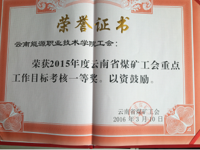 我委云南能源职业技术学院工会获2015年省煤矿工会重点工作目标考核一等奖