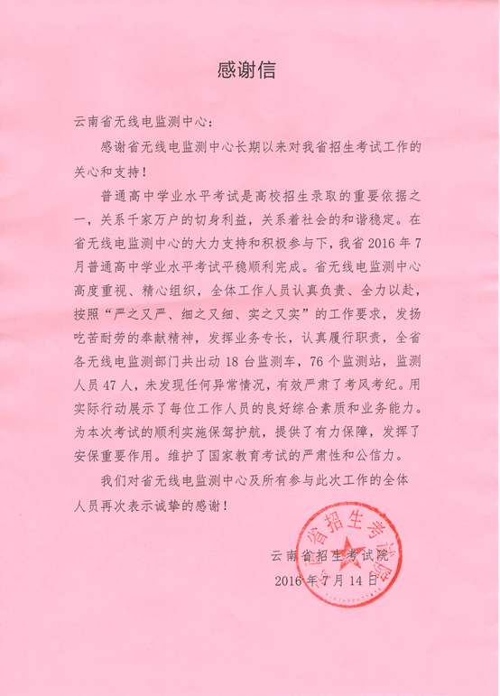 2016年云南省普通高中学业水平考试于2016年7月9日至11日举行,此次考试是高校招生录取的重要依据之一,关系千家万户的切身利益及社会和谐。云南省无线电监测中心积极响应云南省招生考试院邀请,通过前期精心准备、频谱摸排、分析选择重点区域及关键位置来合理高效分配无线电监测力量等有效手段,克服了本次考试考点众多且分散等诸多困难,全力组织开展了对本次考试的无线电安全保障工作。此次无线电安全保障工作全省共派出监测保障技术人员47名,调动移动监测车18辆,调用76个固定监测站及设备,保障过程中未发现作弊信号,有力地维护了考试的严肃性、公平性和公正性,创造了一个公平竞争的环境,维护了广大考生的切身利益和社会稳定。为此,云南省招生考试院特地送来感谢信肯定我中心在本次工作中做出的突出成绩。