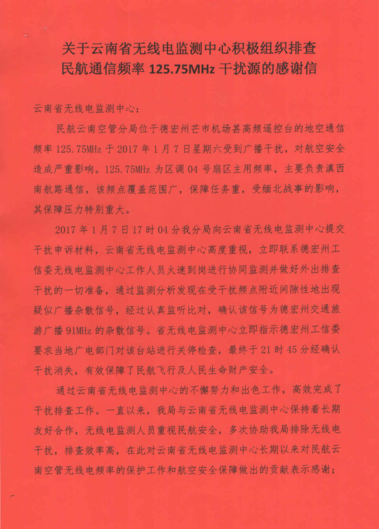 缅北战事期间云南省无线电监测中心高效组织排查边境地区民航通信干扰 民航云南空管分局送来感谢信
