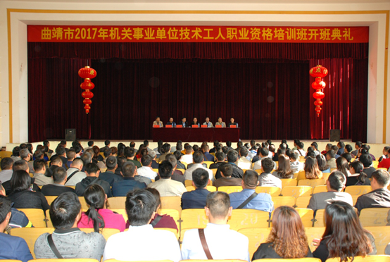 由曲靖市人力资源和社会保障局主办,云南工业技师学院承办的曲靖市2017年机关事业单位技术工人职业资格培训班于2017年4月8日上午在学院举行开学典礼。