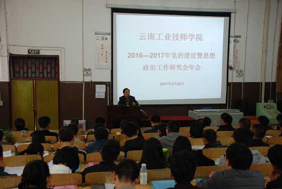 4月28日下午,云南工业技师学院2017年党的建设暨思想政治工作研究会年会在学院老校区阶梯教室隆重举行。学院领导、中层干部、全体会员以及本次年会论文撰写作者共计90余人参加大会。会议由赵兴学院长主持。