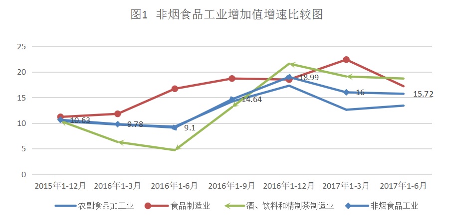 (一)工业生产保持平稳增长。上半年,全省规模以上非烟食品工业突破1000户,约占全省规模以上工业户数的24%。全省规模以上非烟食品工业完成增加值161.91亿元,同比增长15.7%;其中,农副食品加工业完成增加值83.28亿元,同比增长13.4%;食品制造业完成增加值27.57亿元,同比增长17.2%;酒、饮料和精制茶制造业完成增加值51.06亿元,同比增长18.7%。