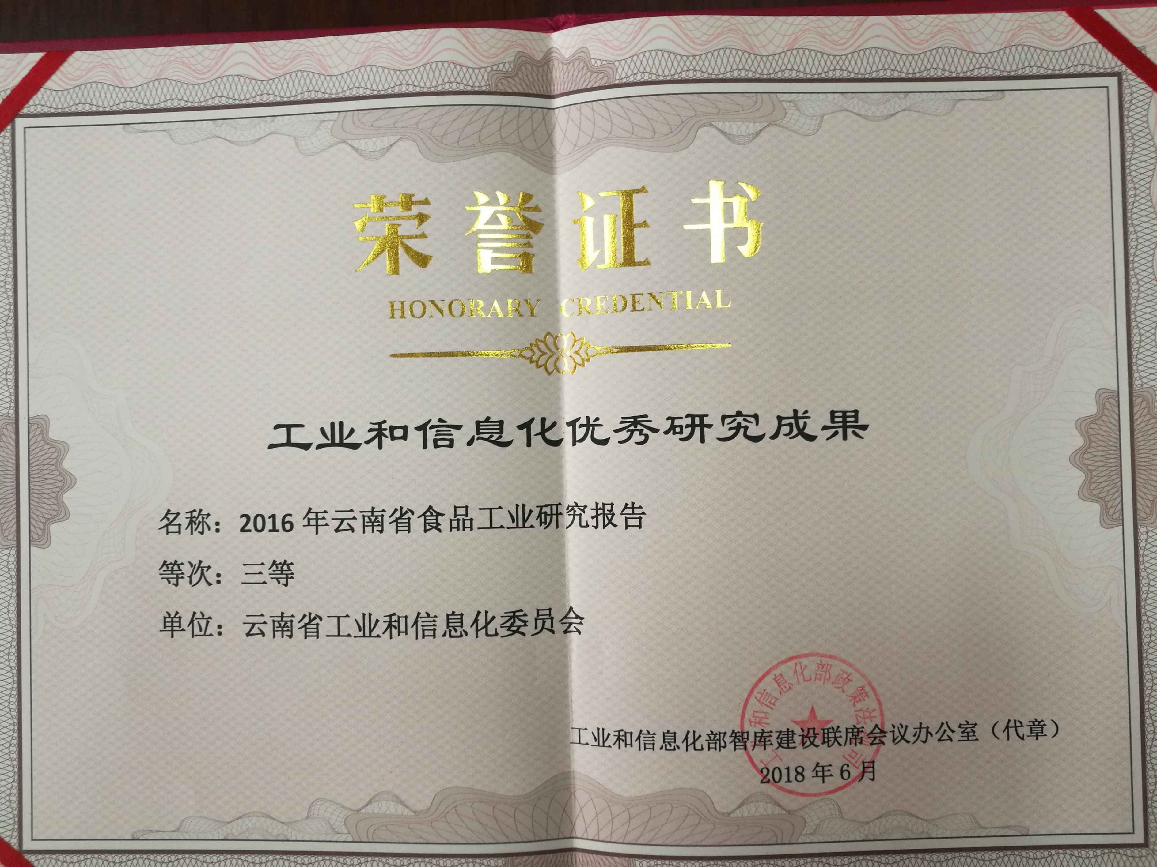 2018年6月,全国工业和信息化优秀研究成果评奖结果揭晓,我委报送的《2016年云南省食品工业研究报告》榜上有名,荣获三等优秀成果奖。