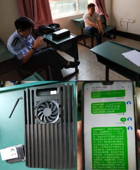 16日下午15:35保障人员在滇池学院考点发现一可疑信号,短暂出现2分钟后消失,信号强度较强,判断发射源在考点附近,保障人员随后在校园内蹲守;16:15可疑信号再次出现,经测向追踪到学思楼附近道路上确认背黑色背包的一名白衣男子;经检查后发现背包内装有作弊设备,该男子手机上有考试答案的短信,随后公安人员对其进行进一步处理。