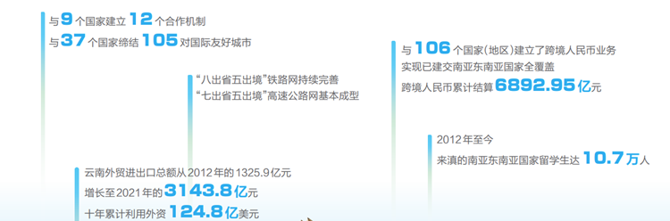 2012年至今,10.7万名南亚东南亚国家留学生来滇逐梦;云南与南亚东南亚国家共建的10个联合实验室、14个国家级国际科技合作基地和69个省级国际科技合作基地,激发创新活力;“七彩云南·文化周边行”访演活动和中缅胞波狂欢节等民族文化节庆活动,拉近彼此距离;“光明行”、“爱心行”公益医疗活动,为相关国家民众送去新的希望。