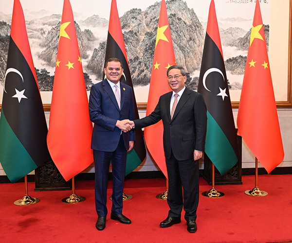 5月29日下午,国务院总理李强在北京钓鱼台国宾馆会见来华出席中国-阿拉伯国家合作论坛第十届部长级会议开幕式的利比亚民族统一政府总理兼外长德拜巴。新华社记者 饶爱民 摄
