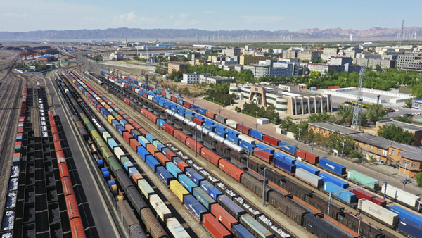 2024年5月25日,在新疆阿拉山口站宽准轨编组场,出入境中欧班列集结等待出发(无人机照片)。新华社发(于晖 摄)