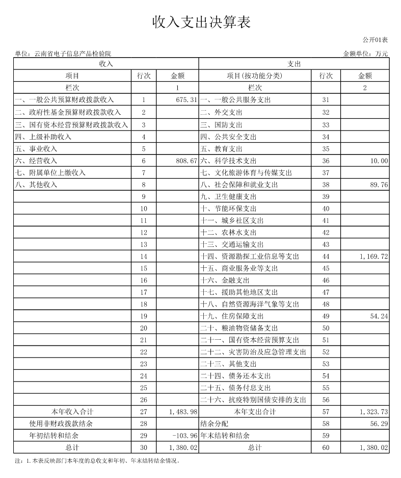 备注:云南省电子信息产品检验院2020年无政府性基金预算收支,无国有资本经营财政预算收支,故《政府性基金预财政拨款收入支出决算表》和《国有资本经营预算财政拨款收入支出决算表》无数据。