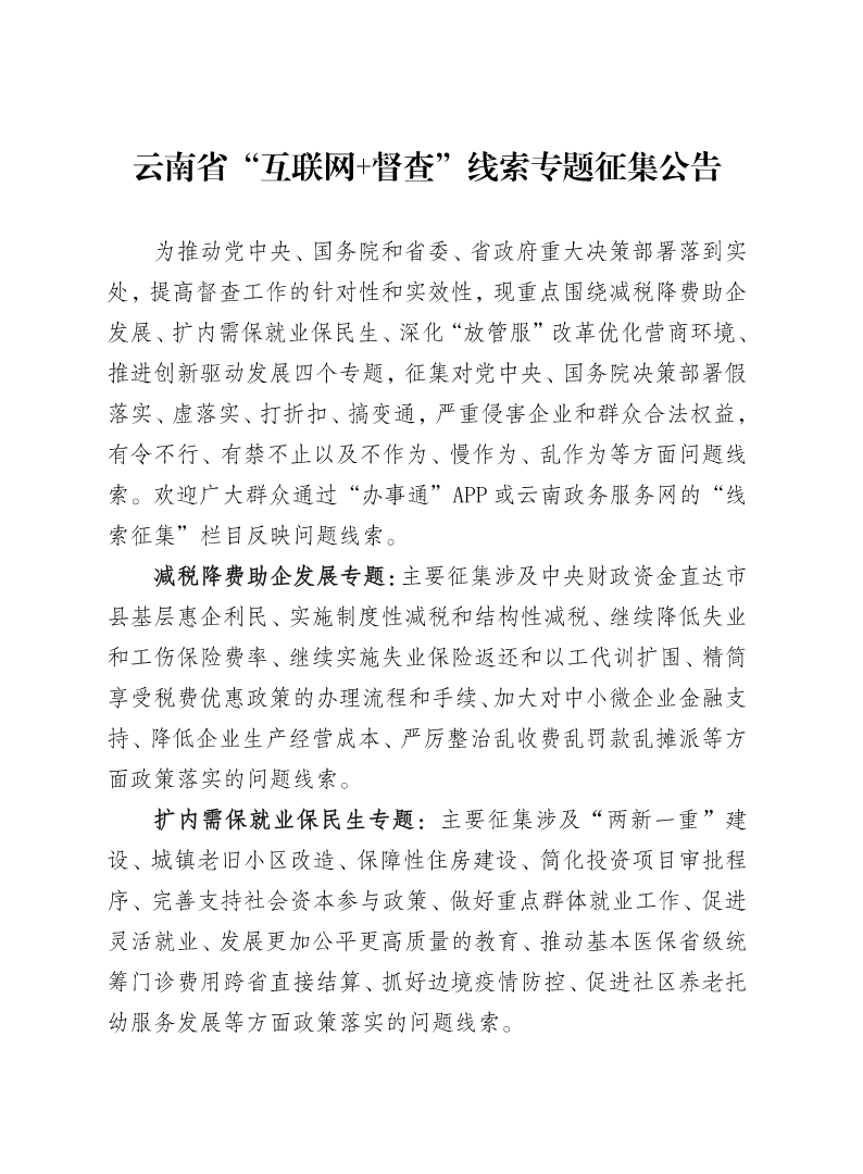 索引号: 3070211020000013000000/2021080400000261 发布机构: 生效日期: 2021-07-23 废止日期: 文 号: 主题分类: 公告文章 云南省“互联网+督查”线索专题征集公告 发布时间:2021-08-04 浏览次数: 次 【字体:小 大】 【打印正文】 【字体:小 大】