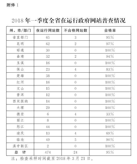 云南省人民政府办公厅关于2018年一季度全省政府网站普查情况的通报