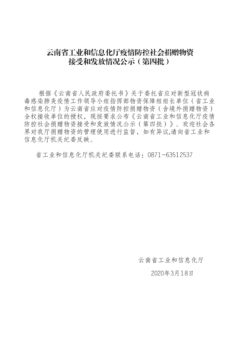 索引号: 3070211020000013000000/2020122500000449 发布机构: 云南省工信厅 生效日期: 2020-03-20 废止日期: 文 号: 主题分类: 重点领域信息公开 88影视 疫情防控社会捐赠物资接受和发放情况公示( 第四批) 发布时间:2020-03-20 浏览次数: 次 【字体:小 大】 【打印正文】 【字体:小 大】