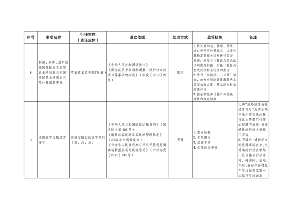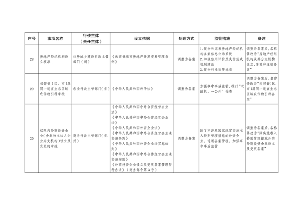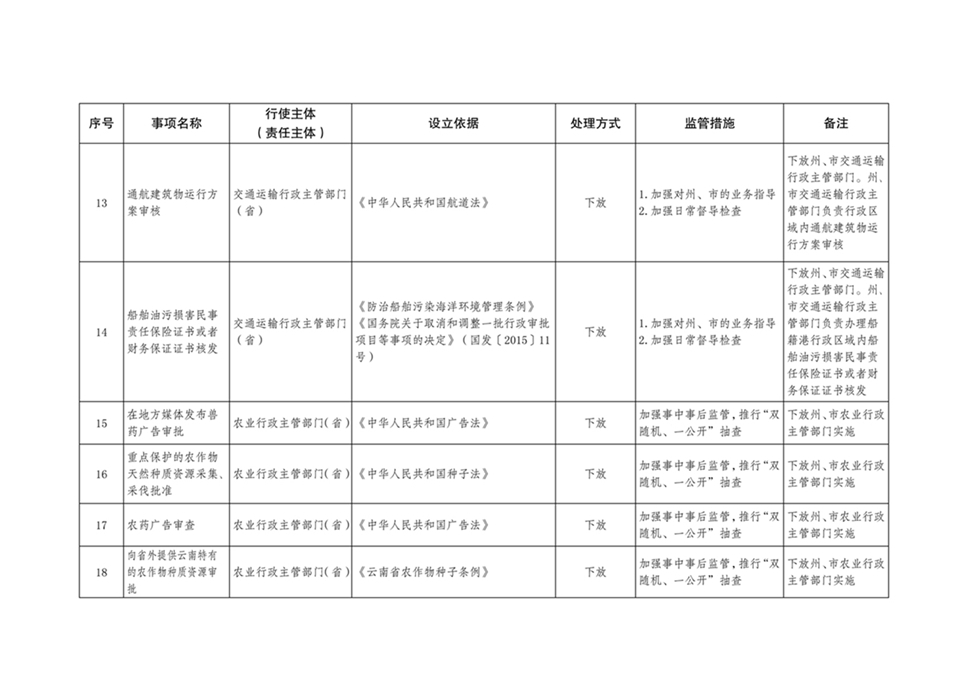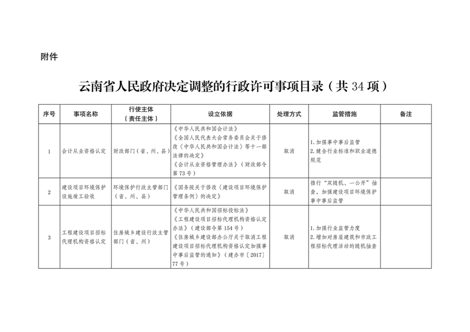 为进一步转变政府职能,持续深化我省简政放权、放管结合、优化服务改革,优化营商环境,根据《云南省人民政府关于印发云南省政府工作部门权责清单管理办法的通知》(云政发〔2017〕64号)有关规定,省人民政府决定调整34项行政许可事项(详见附件)。