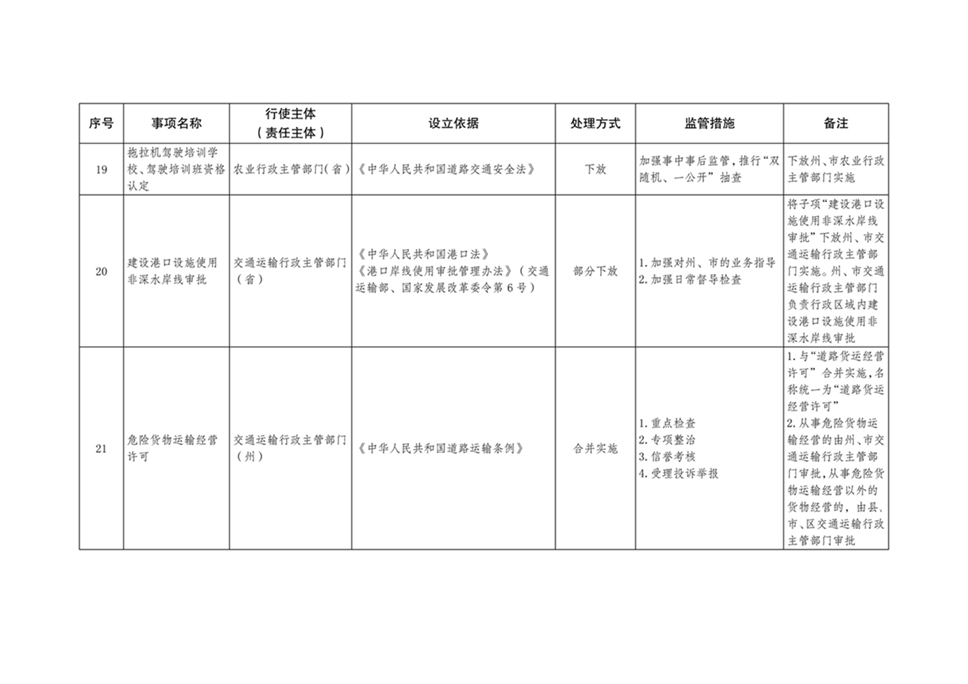 各地各部门要按照“法定职责必须为”的要求,依据职责切实加强行政许可事项调整后的事中事后监管,全面推行“双随机、一公开”。省直各部门要加强对州、市、县、区的指导和培训,确保放得下、接得住、管得好。